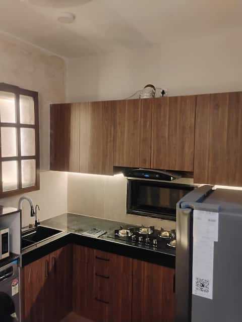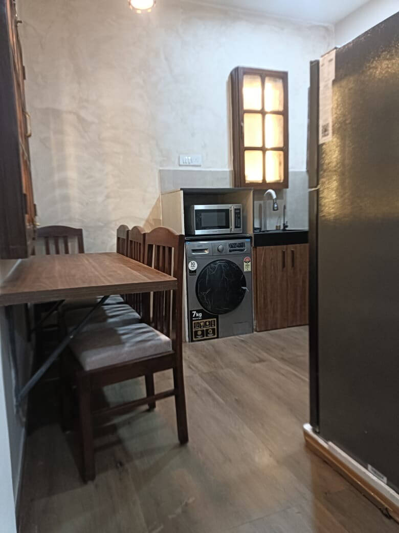 The fully equipped kitchen includes a stove, refrigerator, microwave, kettle, and essential utensils. A washing machine is also available, making it ideal for longer stays.